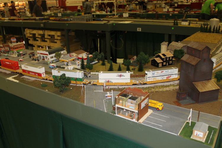 The same train as in the previous photo continues on its trip around the RRMA. This view is taken from outside the loop. Note the clear roof and back wall on the hardware store in the foreground that allows visitors to see the interior details. The main street of Sandy Beach is across the tracks.