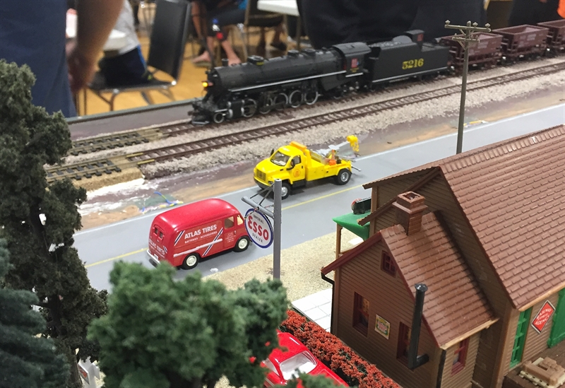 Since the event highlighted CN's 100th anniversary, we added some steam ower to the layout for the day, graciously rovided by RRMA's Bruce Plouffe. The 2-10-2 unit hauls a long line of taconite ore cars past a 1950's general store.