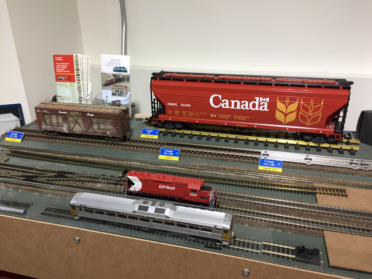 An RRMA-designed and built module at the old Redline Hobby in Regina included samples of track and rolling stock in four scales - N (1:160), HO (1:87), O (1:48) - both two and three rail tracks, and G (1:24) or garden scale.