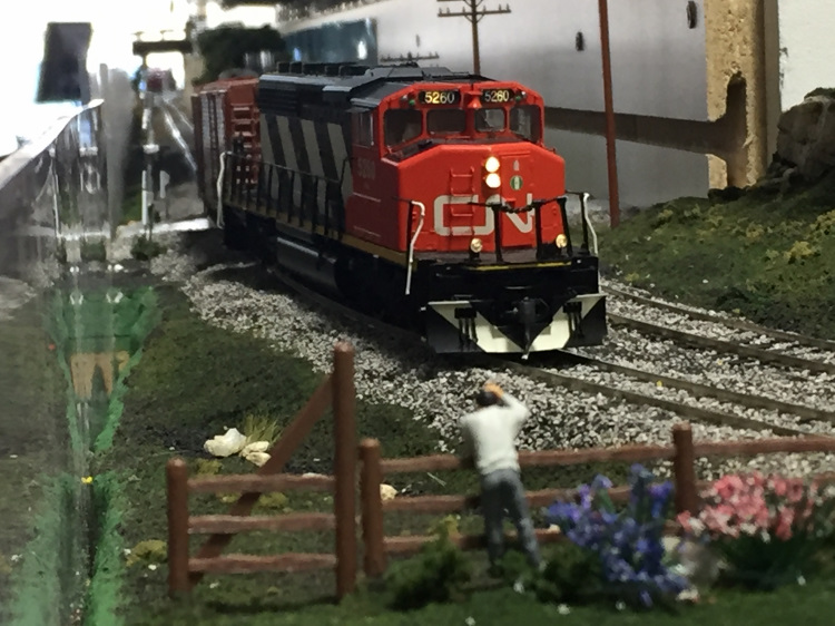 Our Redline Hobby railfan catches CN 5260, an Intermountain SD40-2w, passing his yard. Lots of power for a single box car! The layout is dual-wired for DC and DCC operation.