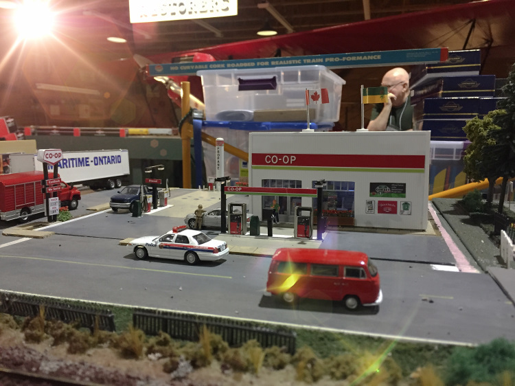 Every Saskatchewan small town has a Co-op. This is the Sandy Beach Co-op store and gas bar. It was kitbashed from a Walthers Cornerstone kit. The gas pumps and propane dispenser were scratch built. (Thunder Creek Show; Moose Jaw; March 2017)