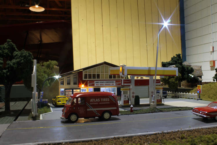 Our town also has the Sandy Beach Convenience Store and Shell gas bar. This building was kitbashed from a basic Plasticville ranch house kit. It has a detailed interior and a few lights. (Thunder Creek Train Show; Moose Jaw; March 2017)