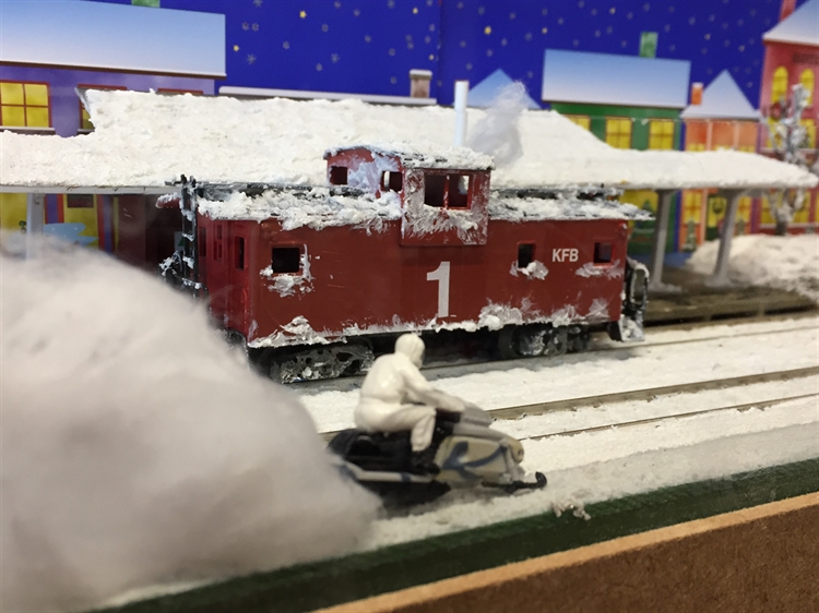 This is something you wouldn't do in real life. This snowmobiler's a bit too close to the rails as he speeds past Loganville station and the KF&B caboose. That's quite a cloud of (cotton) snow he's throwing up!