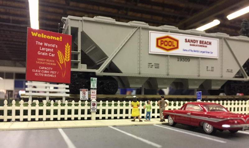 The World's Largest Grain Car is found at Sandy Beach. The giant (O scale) car can hold 13,832 cubic feet or 10,770 bushels of grain. Our visting family appears to be awestruck by the size of the car!