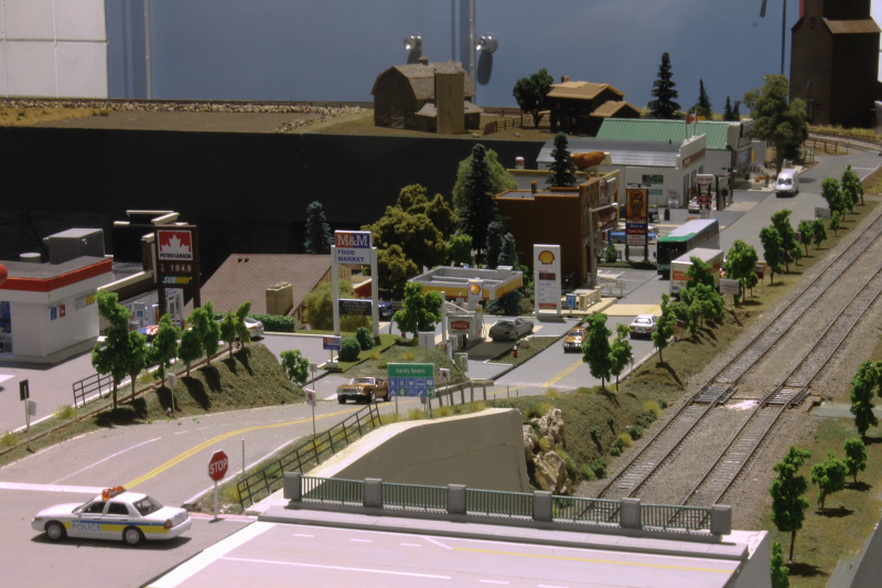 A view along the main street of our fictional Sandy Beach, Saskatchewan includes a Petro-Canada station, the M&M Food Market, the Sandy Beach Convenience store and Shell station, Vic's Barber Shop, Smokin' Okies BBQ restaurant, the local Co-op, the Italian Star Deli and the Bean There Café coffee shop. All buildings along main street were built by David Onodera and feature detailed interiors.